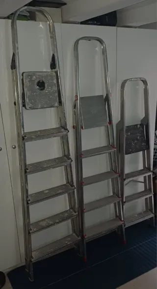 Se venden tres escaleras de aluminio de diferentes tamaños. Son ligeras y resistentes. precio por todo 55 euros - Escalera mediana de 5 peldaños. - Escalera pequeña de 3 peldaños.