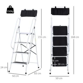 Escalera plegable de tijera con cuatro peldaños. Fácil de guardar y transportar. - Estructura de metal blanco. - Peldaños antideslizantes.