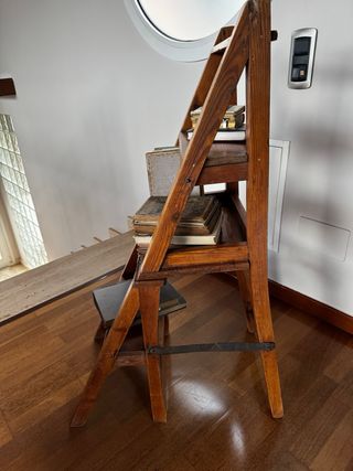 Escalera antigua de madera convertible en silla. Con un diseño versátil que puede adaptarse a diferentes usos. Elemento original de decoración para la biblioteca o para cualquier rincón de la casa. - Fabricada en madera. - Estructura de escalera.