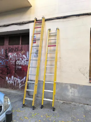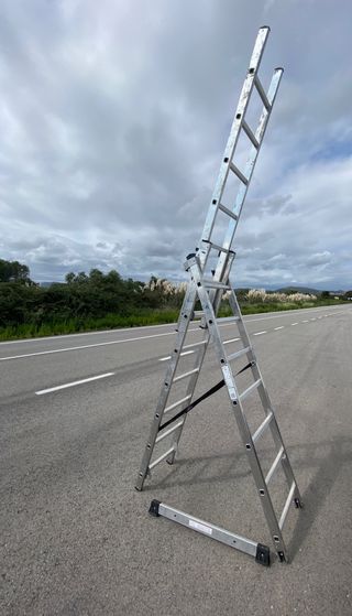 Escalera expansible de gran tamaño. - Material: Aluminio. - Longitud máxima: 4,60 metros. en perfecto estado de funcionamiento..Solo con manchas/ polvo por rstar guardada y usar para pintar 1 vez al año. la vendo porque no la uso, con una mas pequeña que ya tengo me apaño.