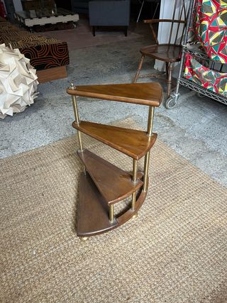 Elegante estantería de madera con estructura metálica dorada, ideal para cualquier rincón. - Diseño de escalera. - Tres niveles. - Forma triangular de las baldas.
