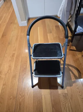 Escalera plegable de dos peldaños con asa. - Peldaños antideslizantes. - Estructura metálica. - Asa con agarre acolchado..