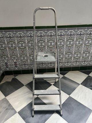 Escalera de aluminio con cuatro peldaños. Es ligera y fácil de usar. - Material: Aluminio. - Número de peldaños: 4. está como nueva, solo que un poco sucia porque la usé para pintar unas paredes, pero nunca más la he utilizado
