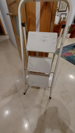 Escalera plegable de tres peldaños, ideal para tener en casa. Usada pero en perfecto estado. Muy fuerte. Para recoger en Plaza Colon. - Color blanco. - Diseño plegable para fácil almacenamiento. - Tres niveles de altura.