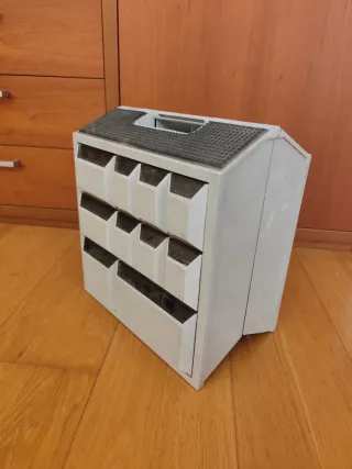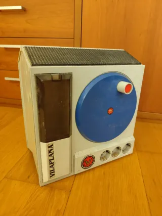 Base de enchufe de la marca VILAPLANA con diseño retro. - Frontal con dial azul y botón rojo. - Tres enchufes. - Compartimento lateral con tapa. - Detalle de logo V en frontal.