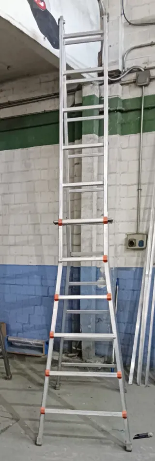Escalera con 3 opciones de posicionamiento! Posición en A unos 2 metros! Posición estirada 3 +/-. Posición andamio 1m d alto! Apenas usada con polvo! HAGO ENVÍO