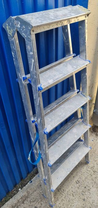 Escalera de aluminio, práctica y fácil de guardar. Ojo estas escaleras son profesionales fabricadas en Alemania para mí las mejores escaleras del mercado e sido fabricante de rótulo luminosos y ahora las vendo por jubilación - Material: Aluminio. - Diseño plegable.