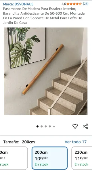 Pasamanos de madera para escaleras interiores o lofts. Incluye soportes de metal para montaje en pared. - Material: Madera y metal. - Longitud: 200 cm. - Diseño antideslizante.