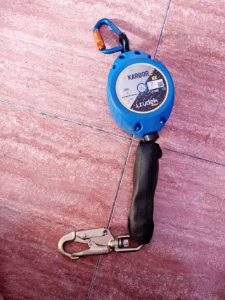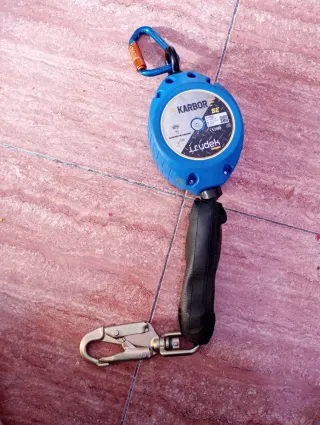 Anticaídas retráctil de la marca TRUDEK, modelo KARBOR SE. - Carcasa de plástico azul resistente. - Mosquetón de conexión con cierre de seguridad. - Empuñadura ergonómica. - Cinta retráctil.