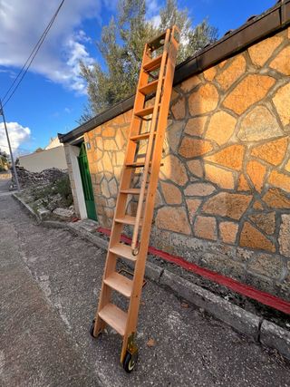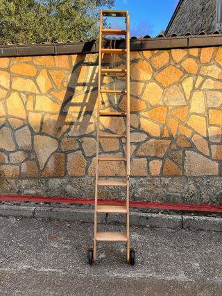 Escalera de madera de haya, ideal para trabajos en altura. Cuenta con ruedas para facilitar su desplazamiento. ESCALERA DE 3,50 DE LARGO X 34 DE ANCHO Y 46 cm DE ANCHO EN LA PARTE DE LAS RUEDAS , 12 cm DE GROSOR Y 21 cm PARTE DE LA BARANDILLA - Fabricada en madera de haya. - Dispone de ruedas en la base. PRECIO POR UNIDAD