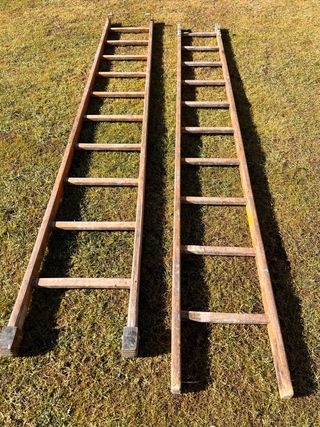 Escalera de madera de dos tramos, ideal para trabajos en altura. Fabricada en madera resistente. Tramos extensibles uno de 350 y otro de 340 , da una altura aproximada de 6,50 . - Dos tramos extensibles. - Construcción robusta en madera.
