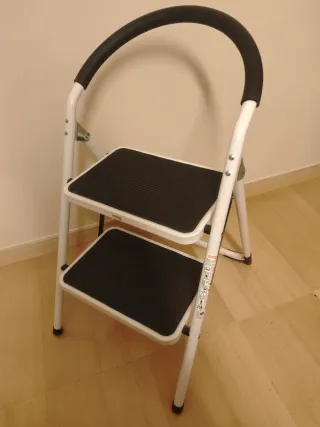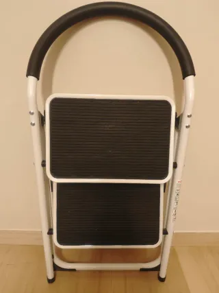 Escalera Plegable de 2 peldaños, 150 kg de Capacidad de Carga, Barra de fijación de guridad Escalones antideslizantes Barra superior acolchada Diseño robusto Medidas: Alto: 89cm. Ancho: 45cm. Fondo: 60cm. Peso 5.5kg. Apenas se ha usado