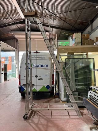 Se venden varias escaleras de aluminio usadas. Están en buen estado, aunque muestran señales normales de uso. - Son 8 escaleras en total. - Ideales para trabajos de altura. - Material: Aluminio ligero y resistente.