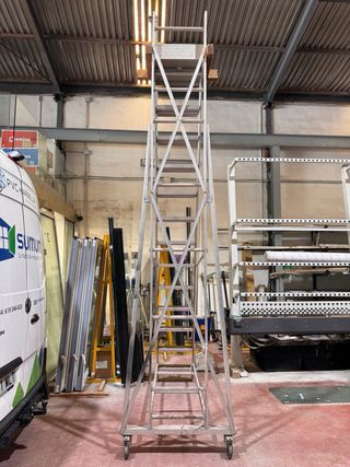 Torre de andamio de aluminio de 10 metros de altura, ideal para trabajos en altura. Fabricada por Euro Towers LTD. - Altura máxima de trabajo de 10 metros. - Carga máxima de trabajo de 750 kg. - Plataforma con carga máxima de 250 kg. - Fabricada en aluminio. - Certificación TUV y GS.