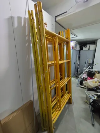 Se venden andamios con bandejas de 2 metros de ancho. Es un lote de 5 cuerpos de andamio completos tipo tradicional, no europeo, comprados hace solo un año y utilizados para una obra en un patio de luces. Son en total 10 marcos de andamio de 2m alto x 1m ancho, 5 bandejas de 2 metros extensibles (una de ellas es vieja), 5 crucetas de 2 metros y 5 barras de seguridad. Si se compra todo el lote lo dejo en 425€ y suelto cada cuerpo de andamio, 100€ (dos marcos, una bandeja y una cruceta). La altura total sería de diez metros, legalmente está permitido hasta 6 m.