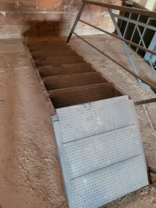 Escalera para exterior toda en metal sin la barandilla de la terraza, pero con otra pequeña parte de escalera para reparar o completar si se necesita algún peldaño.