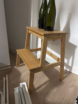 Escalera de madera de bambú con dos peldaños. Es práctica y fácil de usar. - Material: Madera de bambú. - Diseño de dos niveles.