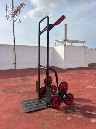 Carretilla diseñada para facilitar el transporte de cargas por escaleras. Su estructura robusta y sus ruedas triples permiten un desplazamiento más cómodo. - Color negro y rojo. - Base de carga amplia. - Mangos ergonómicos. - Soporta 150kg