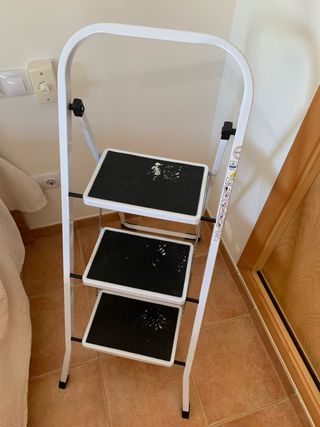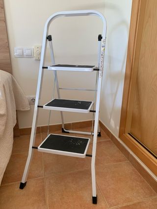 Escalera plegable de 3 peldaños, ideal para tener en casa. - Altura: 111,5 cm - Anchura: 46,5 cm - Estructura metálica. - Peldaños con superficie antideslizante. - Diseño plegable para fácil almacenamiento. Esta como nueva a excepción de las marcas de pintura que tiene en los escalones.