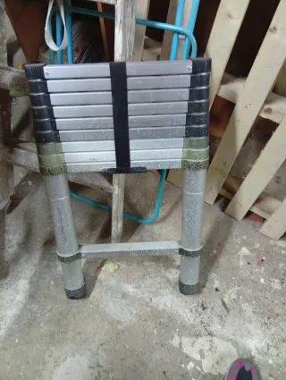 Escalera extensible de aluminio, compacta y fácil de guardar. - Construcción robusta de aluminio. - Diseño telescópico para ajuste de altura. - Bandas de seguridad negras y verdes