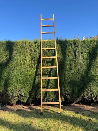 Escalera de madera con diez peldaños tramo simple Con taco de goma en parte inferior en muy buen estado. Alto 3,00 metros Ancho 0,42 metros