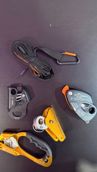 Conjunto de equipo para trabajos verticales. - Mosquetón con cierre de seguridad. - Cinta de anclaje negra con detalles naranjas. - Dispositivo de descenso/ascenso marca Petzl. - Bloqueador ventral. - Ascendedor de pecho. #obra . #escalar . #trabajo vertical . # bajante