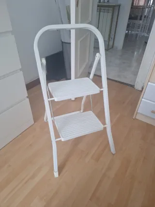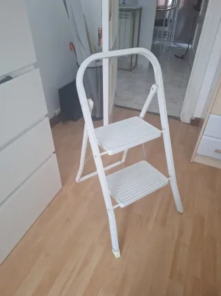 Práctica escalera metálica de dos peldaños, ideal para tener a mano en casa. - Estructura plegable para un fácil almacenamiento. - Diseño en color blanco. Le falta el plástico en una de las patas