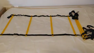 Escalera de agilidad para entrenamiento deportivo. - Diseño con cintas negras y peldaños amarillos. - Ideal para mejorar la velocidad y el control del movimiento. - Largo total 3 metros - 6 peldaños - Bolsa de transporte