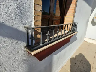 Reja de hierro forjado, ideal para balcones o barandillas. - Diseño clásico con barrotes verticales. - Acabado en color negro. - Elementos decorativos en los extremos.
