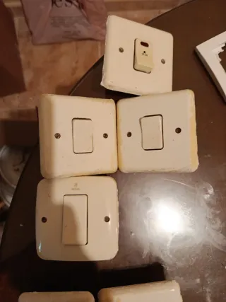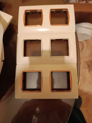 Pack de tres marcos para interruptores de luz. Diseño moderno con borde en tono cobre. - Color: Blanco. - Acabado: Mate. - Material: Plástico. De la marca Simon última foto enchufe de vitro 4€ todo lo demás 2€ pieza todas juntas o sueltas