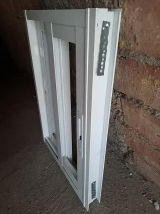 Ventana corredera de aluminio, ideal para espacios interiores o exteriores. Medidas 46,5 ancho 65 alto - Marco de aluminio blanco. - Diseño con dos hojas. - Mecanismo de corredera. Le faltan los cristales
