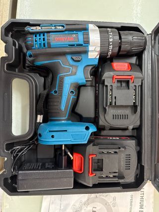 Set de taladro inalámbrico con baterías y accesorios. - Taladro eléctrico con mango ergonómico. - Dos baterías de litio. - Cargador de batería. - Juego de brocas y puntas. - Extensión flexible para puntas.