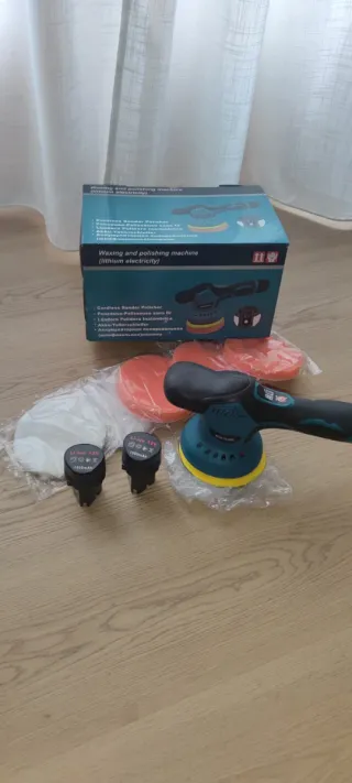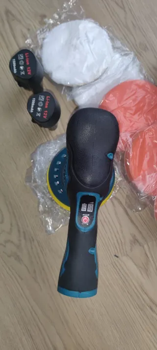 Pulidora y lijadora orbital inalámbrica con baterías de litio. - Incluye dos baterías de 12V. - Viene con varios discos de pulido y lijado.