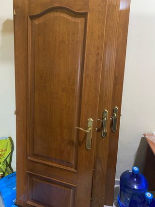 Conjunto de puertas de madera cos sus marcos con un acabado cálido y natural. - Diseño clásico con molduras. - Tiadores dorados. - Ideales para interiores.