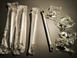 Pack de 4 amortiguadores de gas para puertas de armario. Ideales para facilitar la apertura y cierre suave. - Cuerpo metálico plateado. - Incluye herrajes de montaje. - Las medidas son las siguientes. Entre ejes cerrado tiene 185 mm Entre ejes abierto 302 mm La longitud del cilindro gris es de 150 mm El Ø del cilindro gris es de 15 mm El Ø de la varilla es de 6 mm Tiene un fuerza de 80 N. PARA APERTURA SUAVE Y CONTROLADA. Tiene cada uno sus herrajes completos. Están en sus bolsas sin desprecintar. por unidades a 4 € los cuatro por 15 €