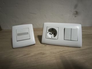 Conjunto de mecanismos eléctricos para pared. -OFERTA TE LO REBAJO A 7 Y TIENES PARA EL PORTE. - Enchufe con toma de tierra. - Dos interruptores de palanca. - timbre. -PRACTICAMENTE NUEVOS -TODO 10 €