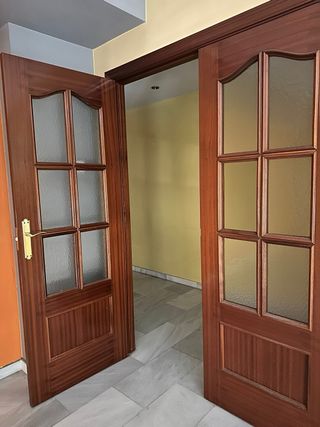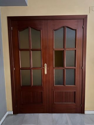 Elegantes puertas de madera con detalles de cristal. 3 puertas Pequeñas de 62cm 3 de 72cm 1 cocina con cristales de 72 2 salon con cristales de 72 cada una (puerta doble) - Acabado en madera oscura. - Tiradores dorados. Ya están desmontadas, solo recoger .