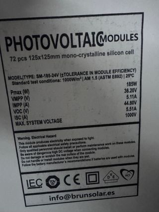 Se venden paneles solares de 185W. Ideales para instalaciones fotovoltaicas. - Voltaje: 36,20v -Amperaje: 5.11A - Marco de aluminio. Si te interesan todas, te las llevas por 440€