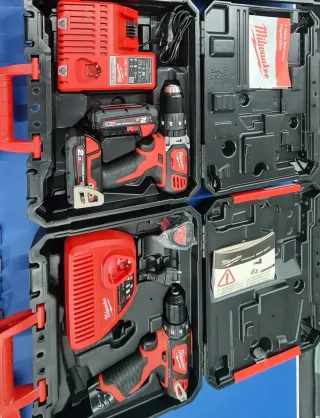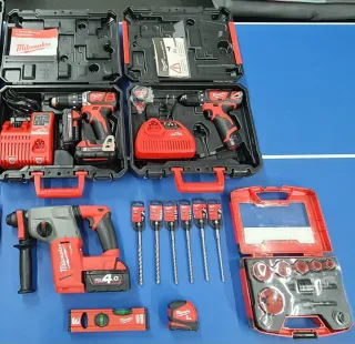 CONTENIDO LOTE: - 1 Taladro y martillo percutor M18CH - 1 Batería m18 4 amperios. - 1 taladro atornillador percutor Mod: m18 bpd-202c - 1 cargador m12-18c - 2 baterías m18 2 amperios. - 1 atornillador Mod: m12 bdd-202c - 1 cargador c12c - 2 baterías m12 2 amperios. - 1 Adaptador angular. - Juego de 10 brocas metal Milwaukee. - Juego de 25 brocas metal HSS-G. - Juego de 10 puntas Milwaukee - Nivel Milwaukee 20 cm - Cinta métrica Milwaukee 5 metros. - 2 brocas Milwaukee 10 mm SDD-plus - 3 brocas Milwaukee 8 mm SDD-plus - 1 brocas Milwaukee 6 mm SDD-plus - 1 Juego coronas + usillos Ratio