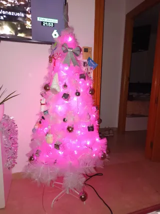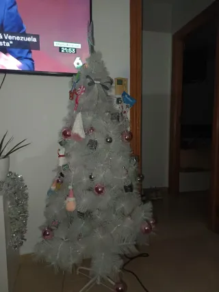 Árbol de Navidad blanco, ideal para decorar tu hogar en estas fiestas. Su diseño moderno y elegante le dará un toque especial a tu decoración. - Color blanco. - Decorado con adornos. - Incluye estrella en la punta. Mide 150cm