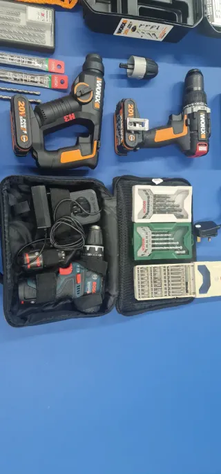 Se vende lote de herramientas eléctricas de las marcas WORX y BOSCH, junto con MUCHOS accesorios. - Taladro percutor WORX 20V. Mod: h3 WX394.6 - Taladro percutor atornillador WORX 20V. Mod: WX373.3 - Taladro atornillador BOSCH. Mod: Profesional GSB 12V-15 - Cargador Bosch. - Cargador WORX. - 2 BATERÍAS 20v 2amp. - 2 BATERIAS Bosch 12v 2amp. - Juego de brocas, puntas, y vasos WORX. - Cinta métrica WORX. - 1 Juego brocas BOSCH SDS plus 5,6,6,8,10. - 1 broca 6mm y 1 broca 8mm ratio. - 1 broca 6mm y 1 broca 8mm SDS plus WORX. - 1 JUEGO 7 brocas piedra BOSCH. - 1 JUEGO 7 brocas metal BOSCH. - 1 JUEGO 24 puntas BOSCH.