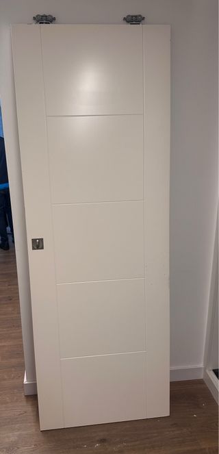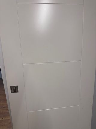 Puerta corredera de diseño moderno en color blanco. Ideal para optimizar espacios. - Acabado liso y elegante. - Diseño con paneles rectangulares. Solo recogida en Armilla