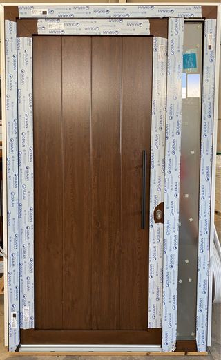 Puerta de entrada de PVC, 1 hoja panelada, modelo IP3 3 lineas, con fijo lateral, acristalada con climalit mate, cerradura de 3 puntos automática, solera, tirador y tapajuntas. Marca: GEALAN Medidas: 1,30 ancho x 2,19 alto Medidas de hoja: 1,05 Medida de fijo: 0,25 Bicolor: nogal exterior y blanco interior