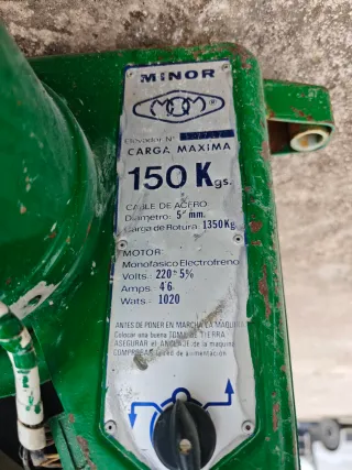 Montacargas elevador marca Minor con capacidad de carga máxima de 150 Kg. - Modelo: Minor - Carga máxima: 150 Kg - Diámetro del cable de acero: 5 mm - Carga de rotura del cable: 1350 Kg - Motor: Monofásico Electrofreno - Voltaje: 220V ±5% - Amperaje: 4.6 Amps - Potencia: 1020 Watts ¡MOTOR REBOBINADO! Que esta nuevo