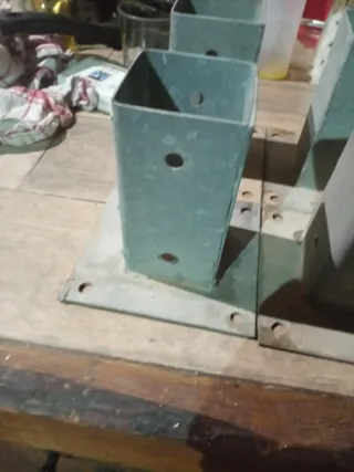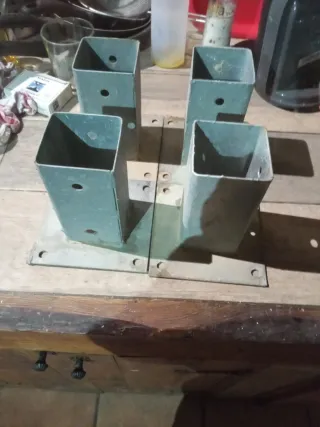 Base de anclaje metálica para postes de 7x7 cm. Ideal para fijar postes de forma segura. - El precio es de los cuatro. - Fabricado en metal galvanizado. - Incluye agujeros para tornillos en la base. - Diseño cuadrado para postes de 7x7 cm.