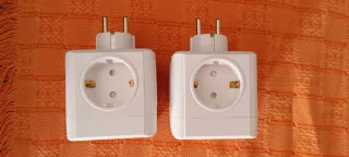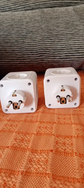 2 Adaptadores de corriente cuadrado con tres enchufes, dos puertos USB y dos tipo C. Tiene luz nocturna con tres tonos diferentes. Es muy cómodo. Solo usado una semana. Los dos 15€, solo uno 10€ - Diseño compacto y cúbico. - Color blanco.