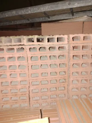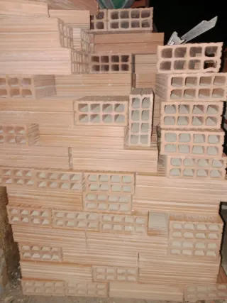 Ladrillos de cerámica de color rojizo, ideales para proyectos de construcción. - Material: Cerámica. - Color: Rojo. - Diseño: Huecos.