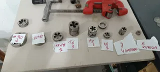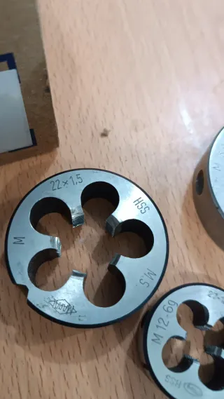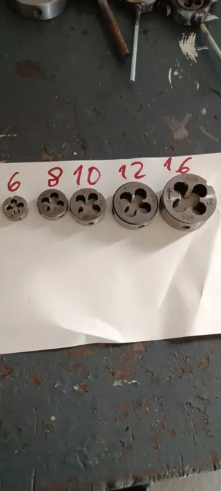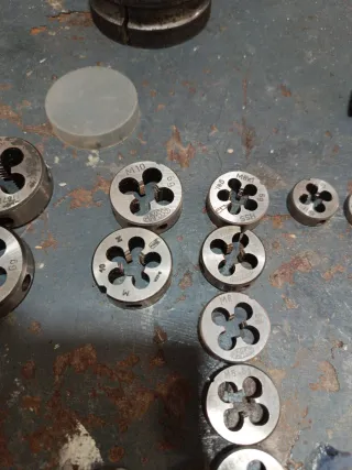 Se vende juego de terrajas de alta calidad, algunas de ellas con marcas. - Terrajas de diferentes tamaños. - Incluye tamaños M6, M8, M10, M12 y M16. - Fabricadas en acero de alta velocidad (HSS). - Ideales para trabajos de roscado.