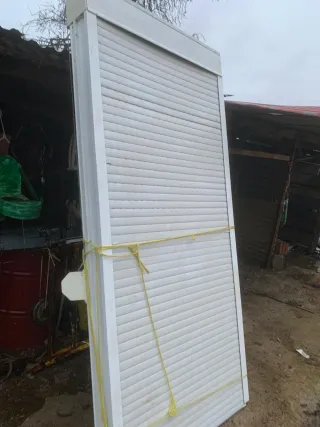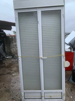Puerta de aluminio con paneles de cristal y persianas integradas. - Marco de aluminio. - Paneles de cristal con lamas. - Persianas enrollables. Medidas 105 de ancho y 230 con el cajón incluido no hago envío solo venta en persona No ago enbios
