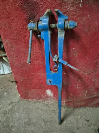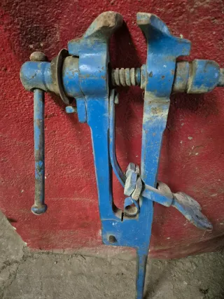 Tornillo de herrero de color azul, diseñado para bancos de trabajo. - Construcción robusta de metal. - Mecanismo de apriete con husillo. - Base para fijación. - Medidas: 10 cm mordaza, 14,5 cm apertura